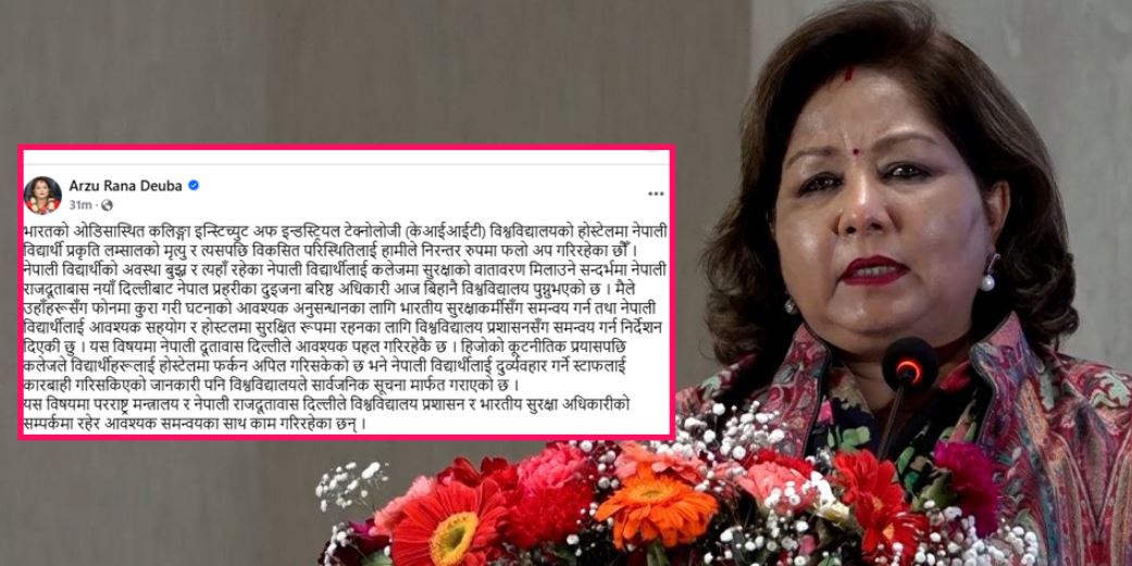 मैले उहाँहरूसँग फोनमा कुरा गरी घटनाको आवश्यक अनुसन्धानका लागि भारतीय सुरक्षाकर्मीसँग समन्वय गर्न तथा नेपाली विद्यार्थीलाई आवश्यक सहयोग र होस्टलेमा सुरक्षित रूपमा रहनका लागि विश्वविद्यालय प्रशासनसँग समन्वय गर्न निर्देशन दिएकी छु’,उनले भनिन्, ‘यस विषयमा नेपाली दूतावास दिल्लीले आवश्यक पहल गरिरहेकै छ ।’