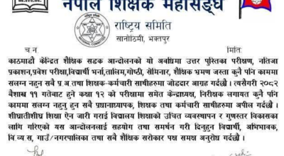 काठमाडौं केन्द्रित शैक्षिक सडक आन्दोलनको यो अवधिमा उत्तर पुस्तिका परीक्षण, नतिजा प्रकाशन, प्रवेश परीक्षा, विद्यार्थी भर्ना, तालिम, गोष्ठी, सेमिनार, शैक्षिक भ्रमण जस्ता कुनै पनि काममा संलग्न नहुन सबै प्रअ तथा शिक्षक-कर्मचारी साथीहरूमा जोडदार आग्रह गर्दछौँ, ‘ विज्ञप्तिमा उल्लेख छ।