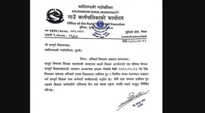 गुल्मीको कालिगण्डकी गाउँपालिकाले शिक्षकहरूलाई १४ गतेदेखि अनिवार्य रूपमा विद्यालयमा उपस्थित हुन निर्देशन जारी गरेको छ । पालिका अध्यक्ष वेद बहादुर थापाले शिक्षक तथा विद्यालय कर्मचारीहरूलाई वैशाख १४ गतेदेखि अनिवार्य रूपमा विद्यालयमा हाजिर हुन निर्देशन दिएका हुन् ।
