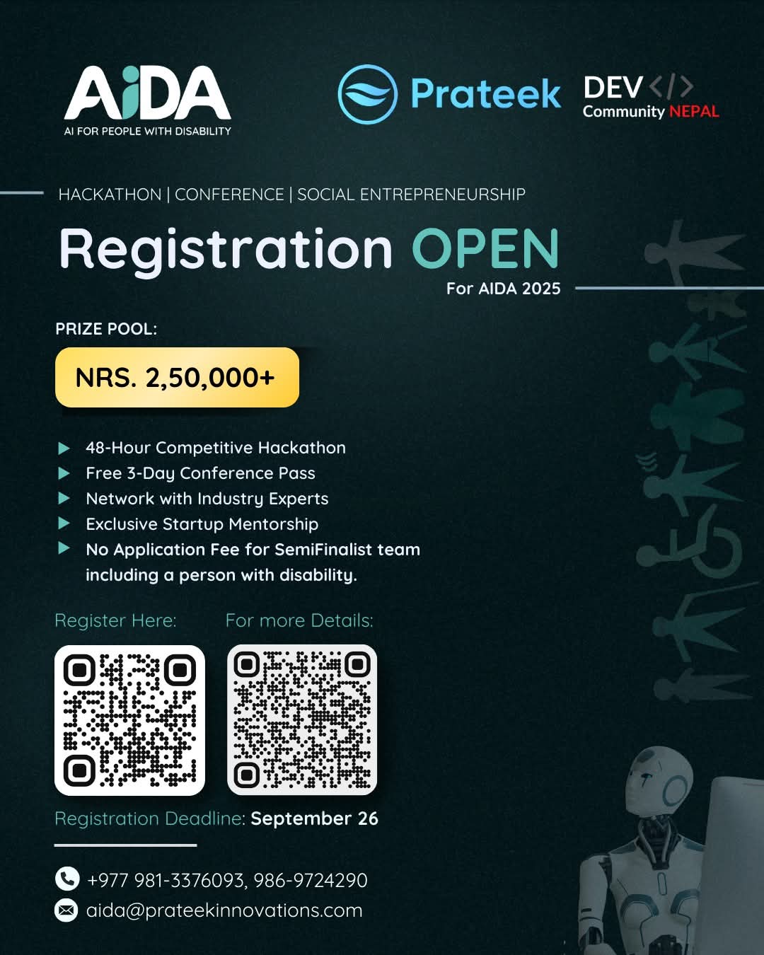 नेपालमा पहिलोपटक अपागता भएका व्यक्तिहरूका लागि एआई (Artificial Intelligence) समाधान विकास गर्ने राष्ट्रियस्तरको ह्याकाथनको आवेदन खुला भएको छ । एआईडा (AI for People with Disability) ह्याकाथन नाम दिइएको यस कार्यक्रमलाई प्रतिक इन्नोभेसन्सले आयोजना गरेको हो । कार्यक्रमले विद्यार्थी, डेभलपर, अनुसन्धानकर्ता तथा नवप्रवर्तकलाई एउटै मञ्चमा ल्याई अत्याधुनिक सहायक प्रविधि (Assistive Technology) विकास गर्ने लक्ष्य लिएको छ । यो केवल प्रतियोगिता मात्र नभई नवप्रवर्तन, सहकार्य र सामाजिक उद्यमशीलताको प्लेटफर्म भएको आयोजकको भनाइ छ । यसले समावेशी प्रविधि विकासमा सहयोग पुग्ने आशा गरिएको छ ।