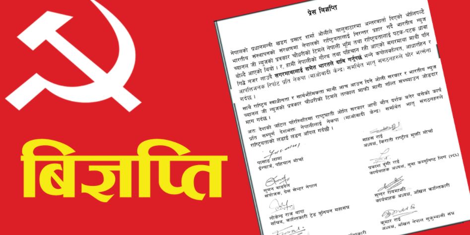 काठमाण्डौ- नेपालको प्रधानमन्त्री खडग प्रसाद शर्मा ओलीले बालुवाटारमा अन्तरवार्ता दिएको भोलिपल्टै भारतीय संस्थापनको संरक्षणमा नेपालको राष्ट्रियतालाई निरन्तर प्र’हार गर्दै भारतीय न्युज च्यानल जी न्युजको प्रत्रकार चौधरीको टिमले नेपाली भूमि तथा राष्ट्रियतालाई पटक–पटक धा’वा बोल्दै आएको प्रति नेकपा (माओवादी केन्द्र) पार्टी समर्थित सँगठनहरुले प्रेस बिज्ञप्ती निकालेको छ । बिज्ञप्तिमा भनिएको छ, ‘हामी नेपालीको गौरब तथा पहिचान…